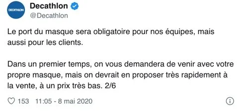 Si le port du masque est obligatoire dans les transports sous peine d’une amende, il ne l’est pas dans les magasins. Toutefois, le Premier Ministre a affirmé lors de son allocution que les commerçants pourraient, afin de faire respecter les règles de sécurité sanitaire, subordonner l’accès à leurs magasins au port du masque. C’est notamment ce qu’a décidé Decathlon en rendant “le port du masque obligatoire dans tous ses magasins et pour tous, employés comme clients”. Ainsi, le port du masque pourrait être imposé aux clients si les commerçants estiment que cela est nécessaire. Le port du masque doit être utilisé avec précaution puisque sa mauvaise utilisation peut être dangereuse, tout comme celle des gants. Le respect des gestes barrières reste la meilleure manière de se protéger et de protéger les autres du virus.